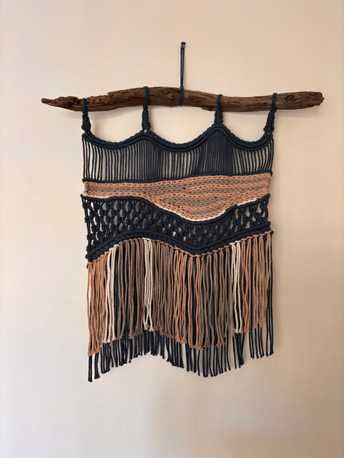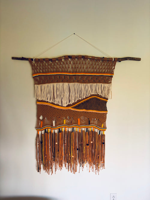 Autumn Mosaic is a one-of-a-kind macramé wall hanging inspired by the layered textures and colors of the fall season. Like a patchwork landscape of changing leaves and earthy ground, this piece brings together a rich variety of knotwork, weaving, and fiber textures.