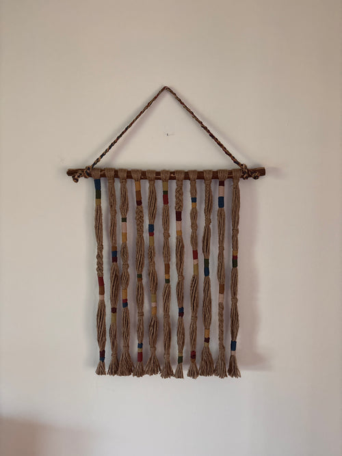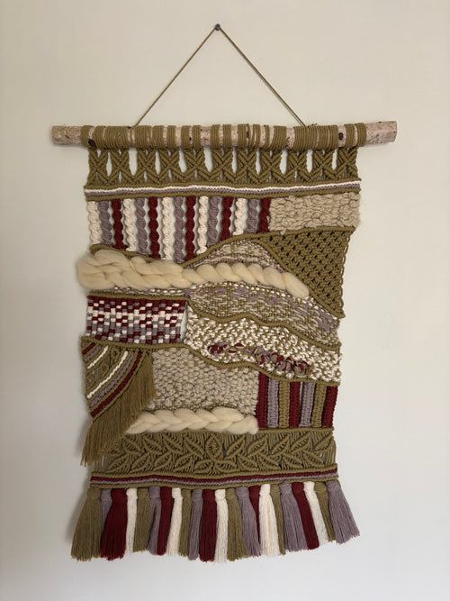 Materials: Cotton cord, wool fibers, woven textiles, natural wood branch
